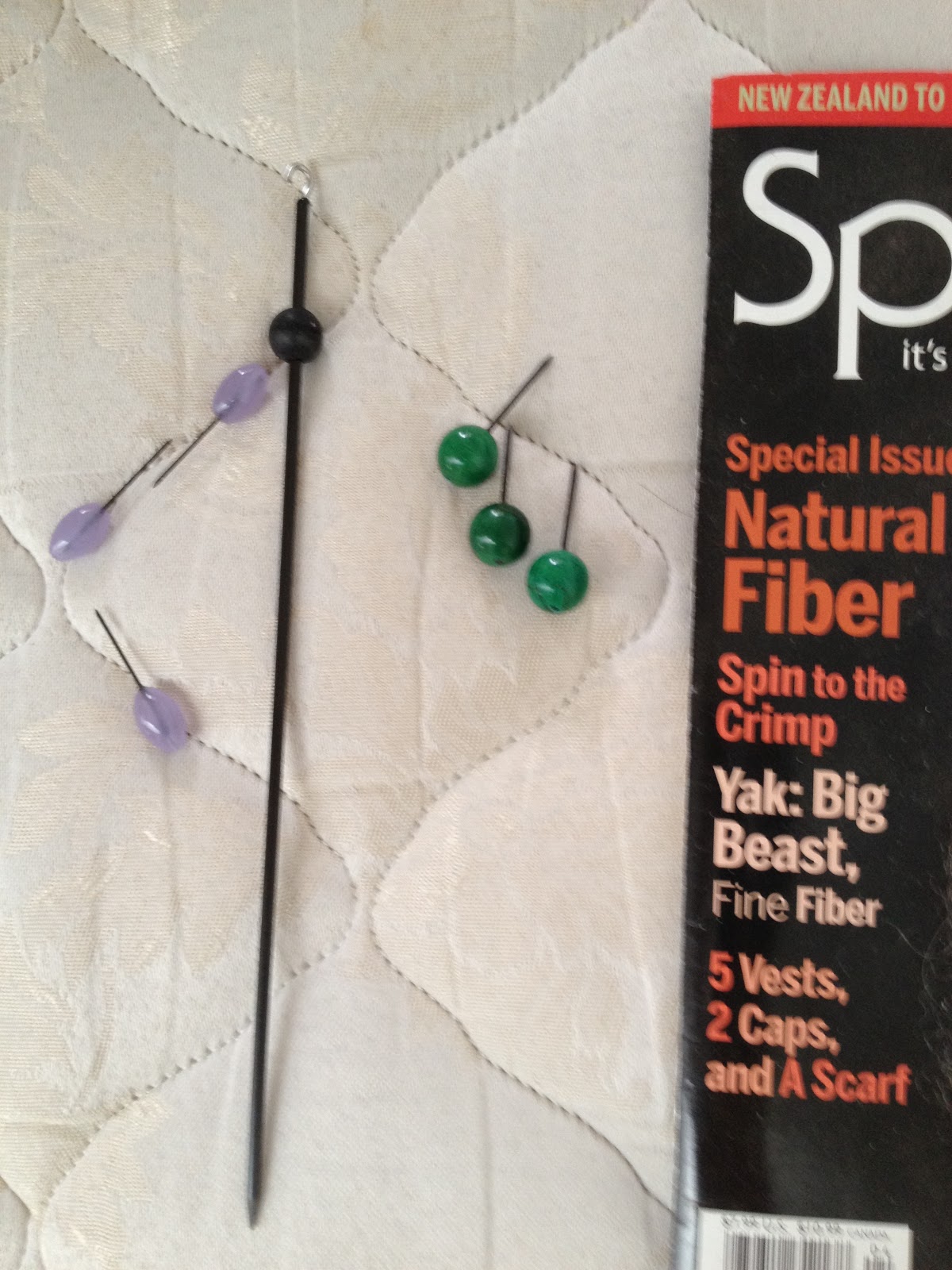 And last but not least, I got my MicroXL Trindle yesterday. It weighs about 4 gms. The two arm sets get added on. The lavender quartz arms on the left weigh 7.1 gms so I can get a spindle that weighs 11.1 gms or one that weighs 16 gms with the arms on the right. The green ones weigh 12 gms. I put the Spin-Off next to it so you can get an idea of the relative length of the MicroXL. It is a very portable spinning project.